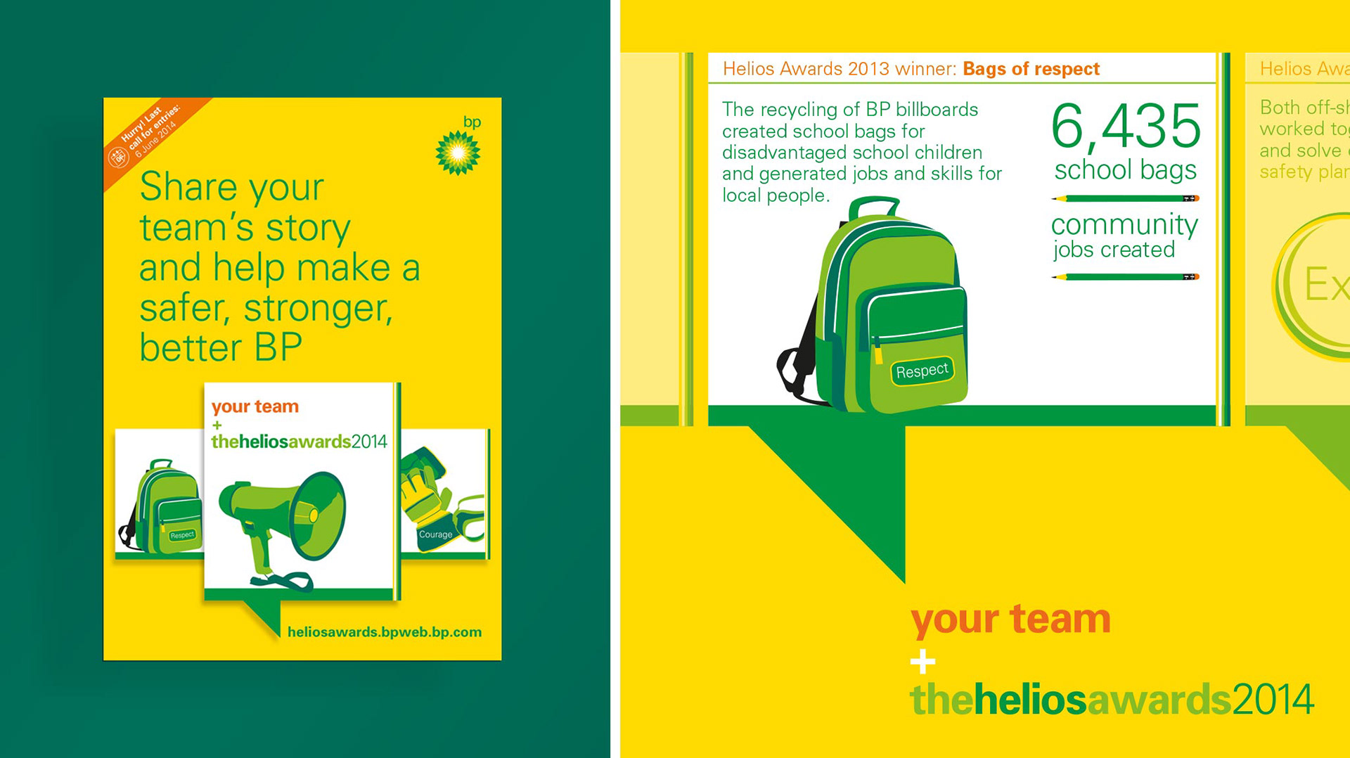 I have worked on a broad mix of BP projects, where the common theme is tackling internal engagement challenges. A good example is The Helios Awards, an internal awards scheme to recognise and thank employees for living the BP values and behaviours. The aim was to engage their people and drive them to submit their work. The campaign was designed to be implemented by BP’s international brand teams across online and print. I worked on the campaign development from brief to generating the final files for print.