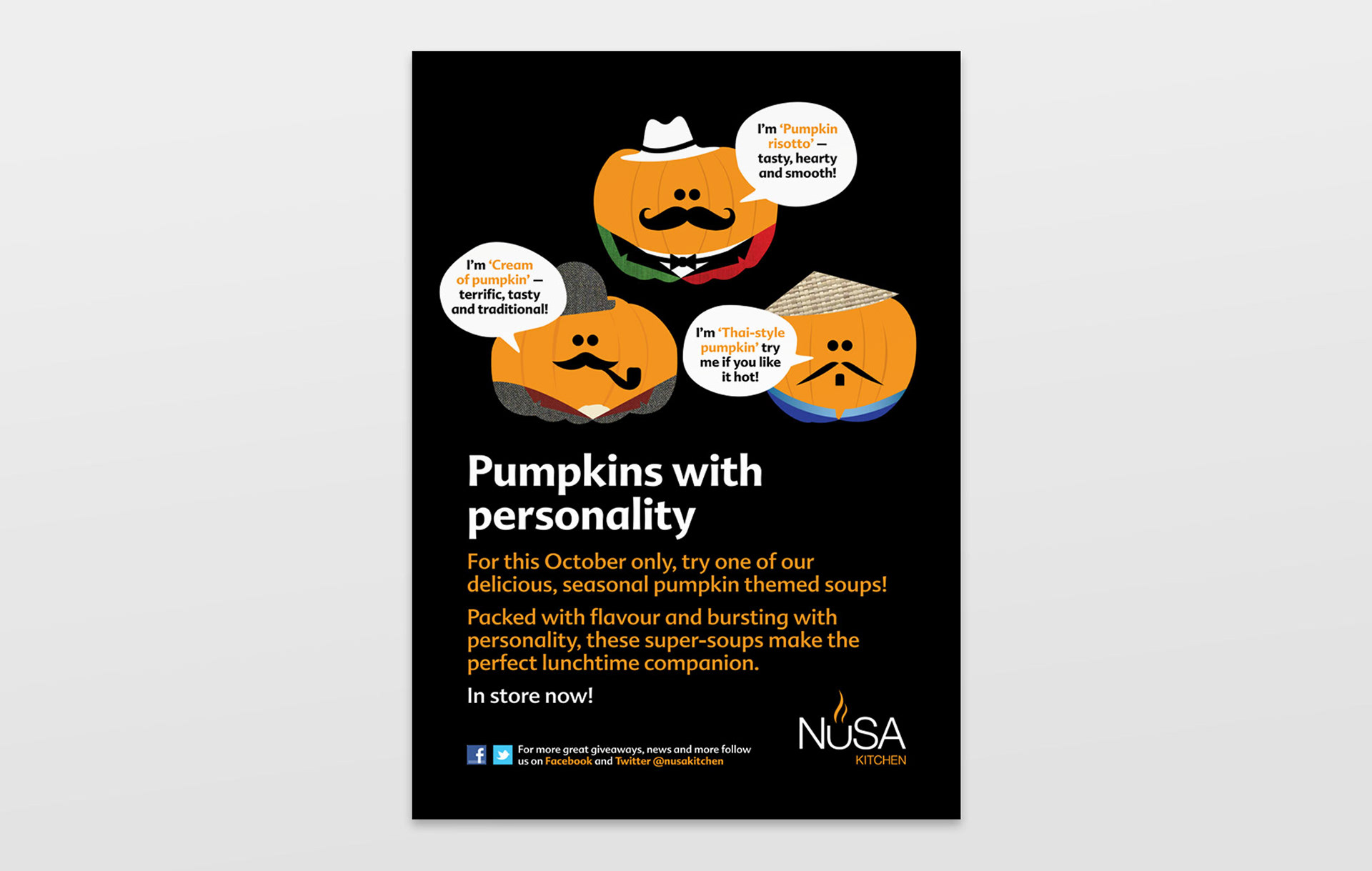Nusa is a London-based soup chain inspired by the flavours of South East Asia. They have three locations around central London. I have worked on many seasonal POS campaigns that involve developing a creative theme which is applied across in-store graphics and social media online.